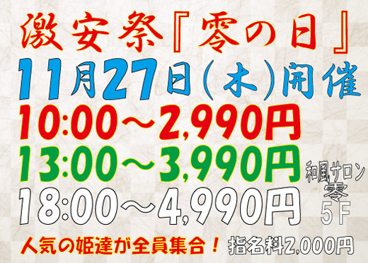- 和風サロン・零より大好評につき、延長継続決定致しました!!!是非翌日出勤の指名したい子がいたらご予約ください!第一・第三木曜日(激安イベント)、他イベントは当日予約のみになります。※予告なく、終了する場合がございますのでご了承のほどよろしくお願い致します。