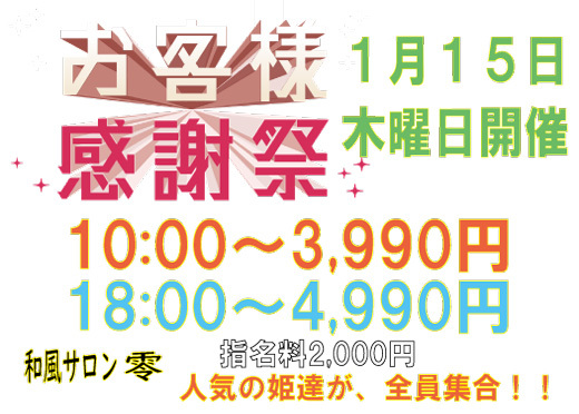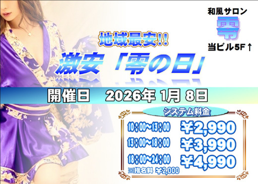 - 和風サロン・零より大好評につき、延長継続決定致しました!!!是非翌日出勤の指名したい子がいたらご予約ください!第一・第三木曜日(激安イベント)、他イベントは当日予約のみになります。※予告なく、終了する場合がございますのでご了承のほどよろしくお願い致します。